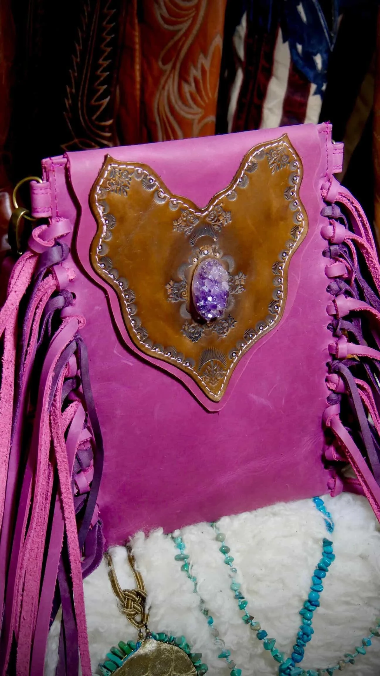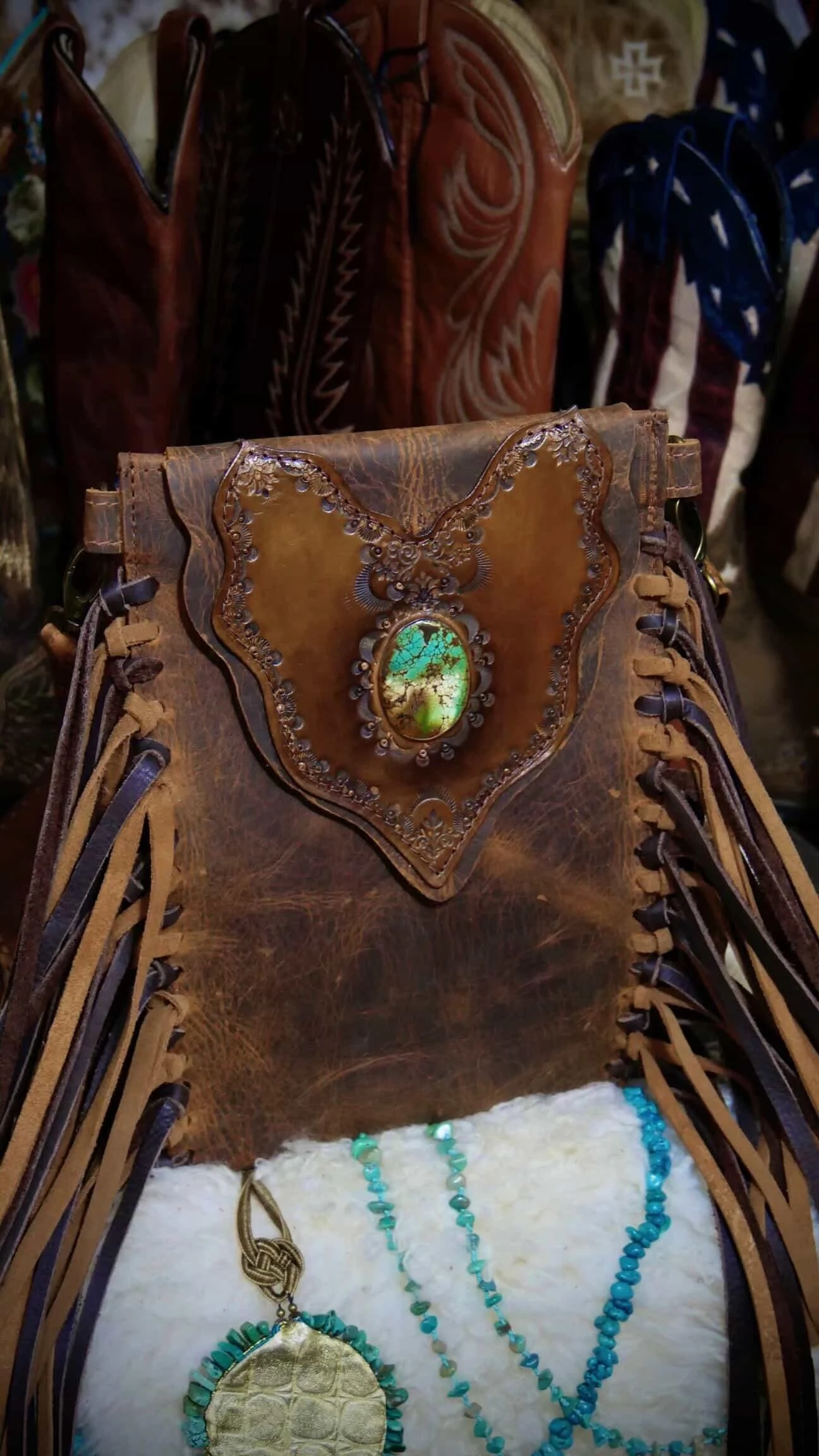 Finished with antique brass hardware and an adjustable strap, this piece blends artisan craftsmanship, natural materials, and classic western character into a wearable piece of art.