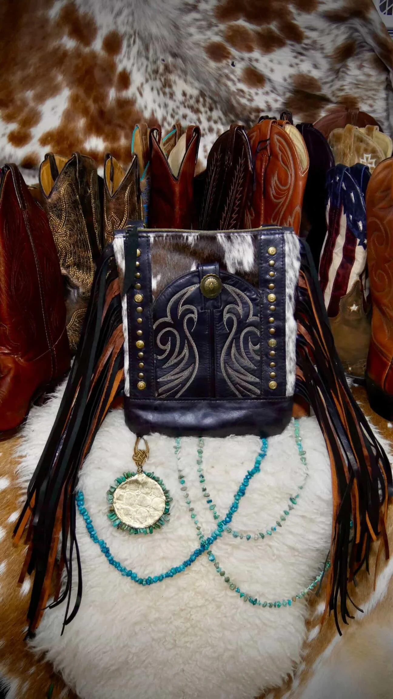 The Ella features a bold hair-on-hide exterior, bringing rich texture and natural variation to a timeless western silhouette. At the center, a black repurposed cowboy boot front pocket adds both function and heritage, perfectly sized to hold your phone while showcasing classic stitching detail.