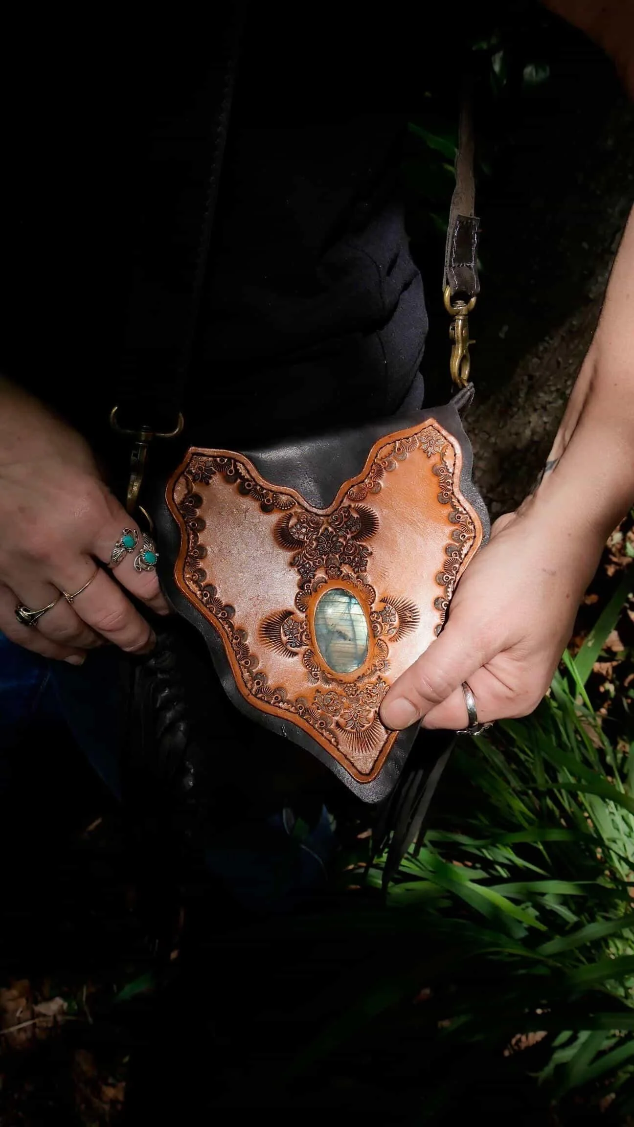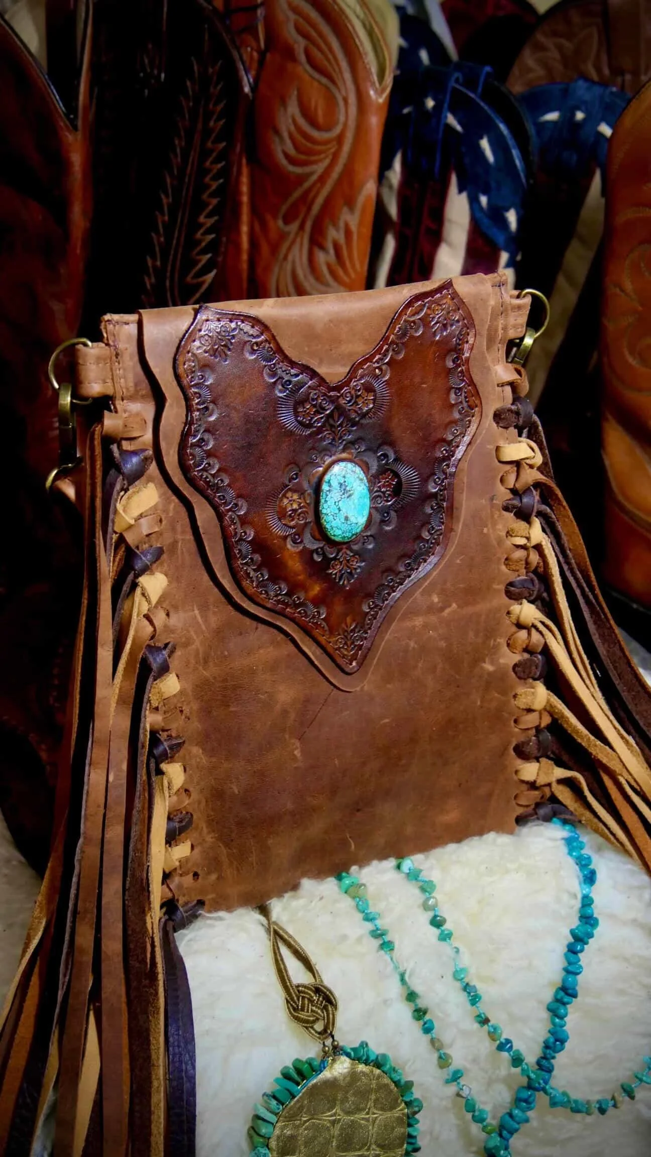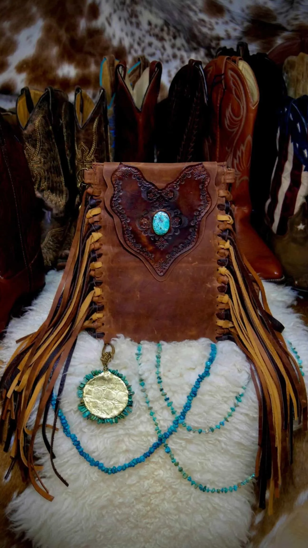 Finished with antique brass hardware and an adjustable strap, this piece blends artisan craftsmanship, natural materials, and classic western character into a wearable piece of art.