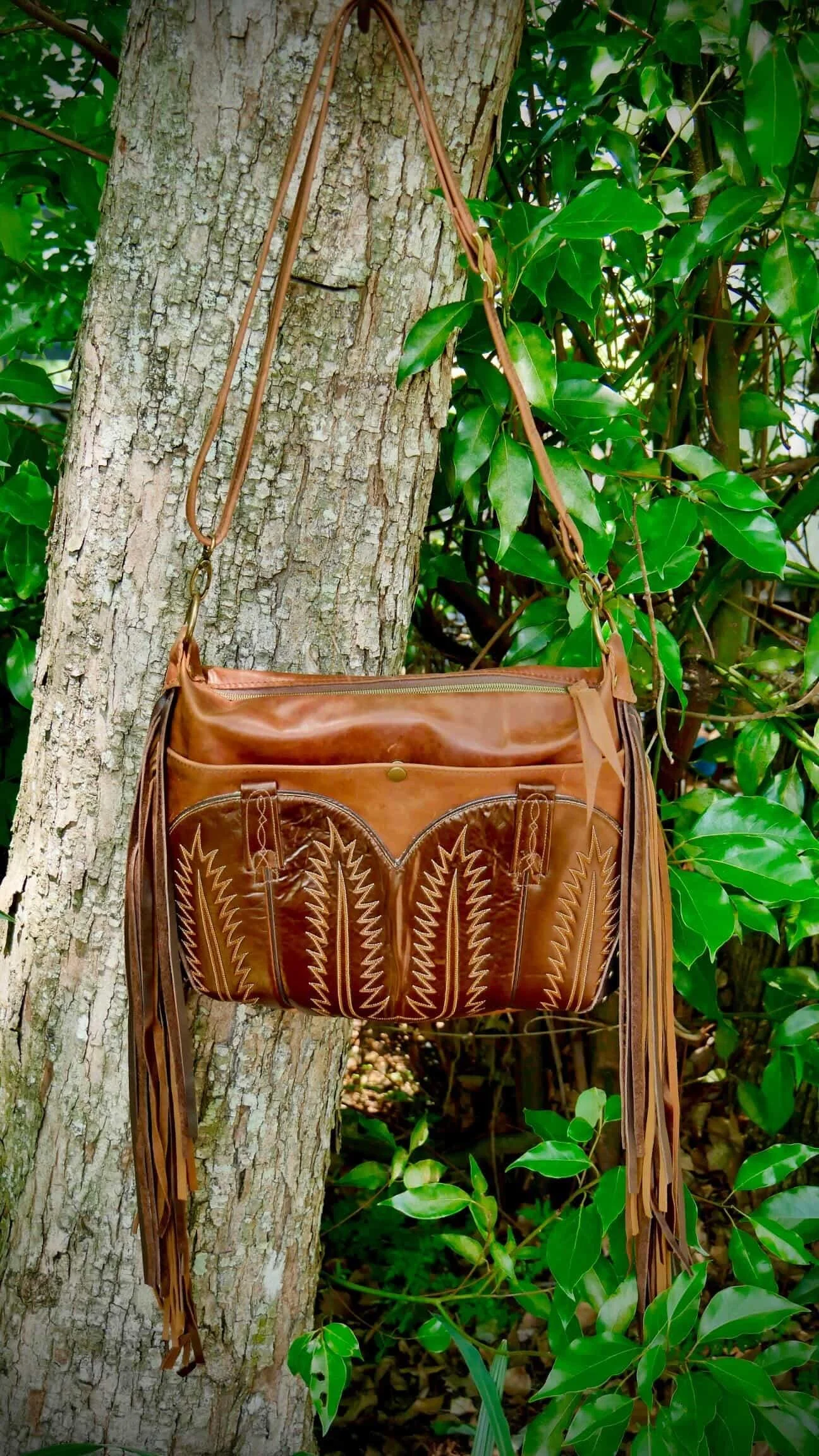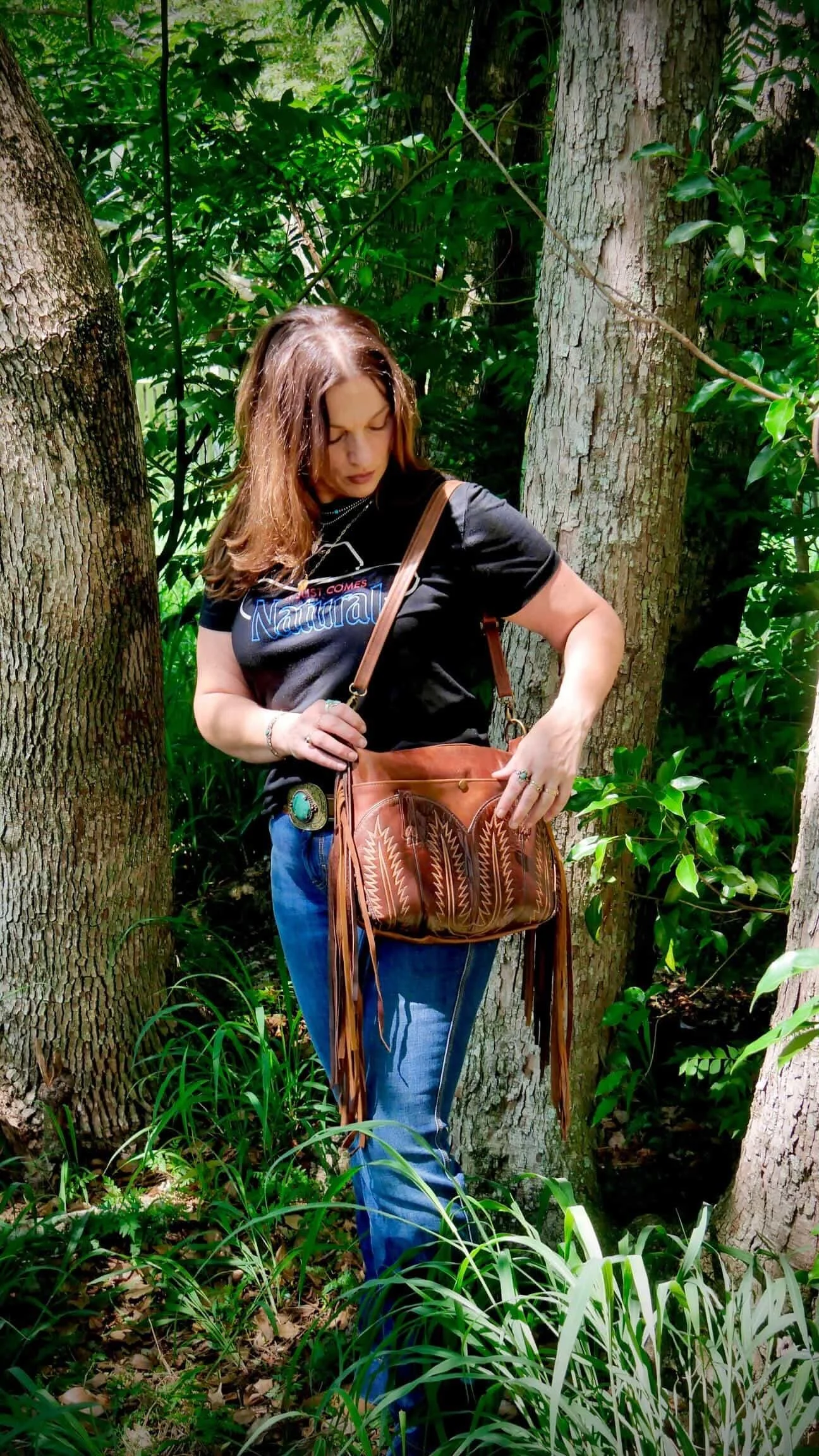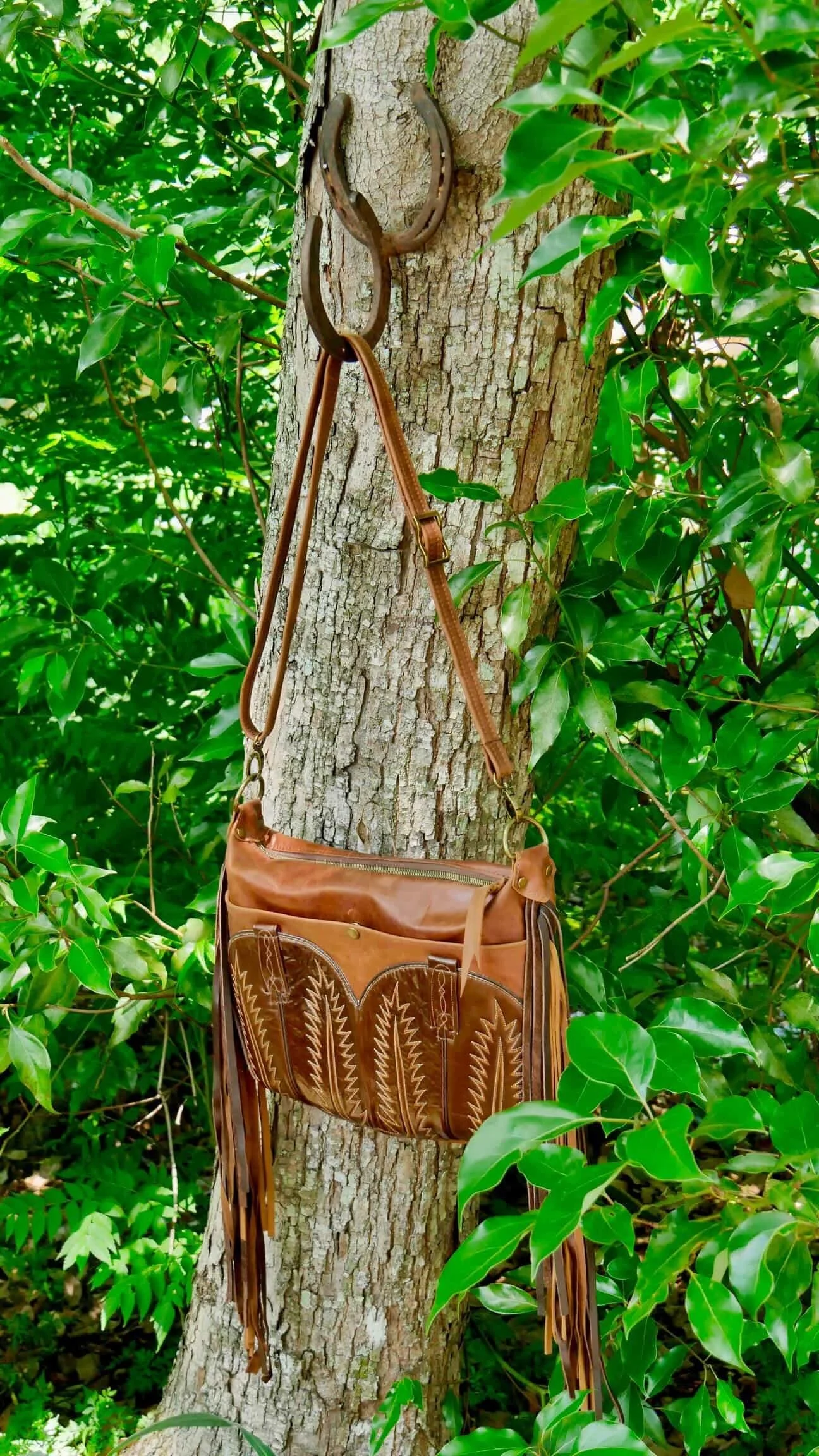 Finished with antique brass hardware and an adjustable strap, this piece blends artisan craftsmanship, natural materials, and classic western character into a wearable piece of art.