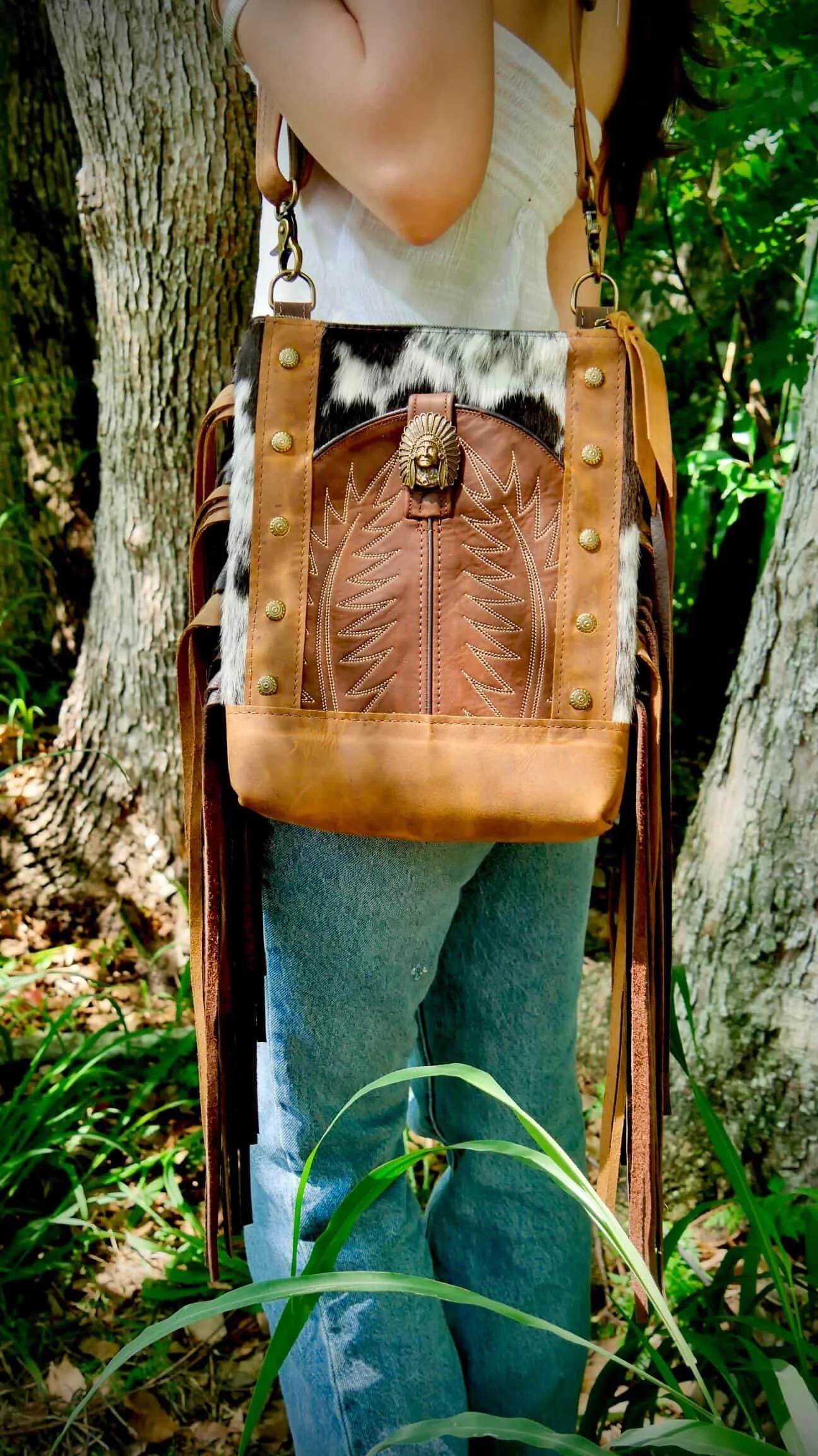 Framed with antique brass decorative hardware used throughout, this bag carries warmth and durability in every detail. A thunderbird accent centered on the lower panel grounds the design with a strong, symbolic western touch.
