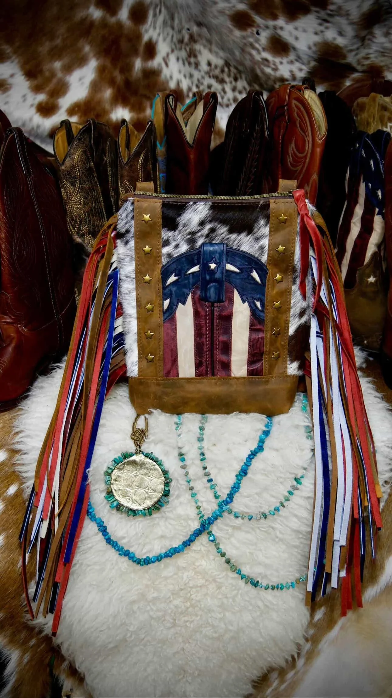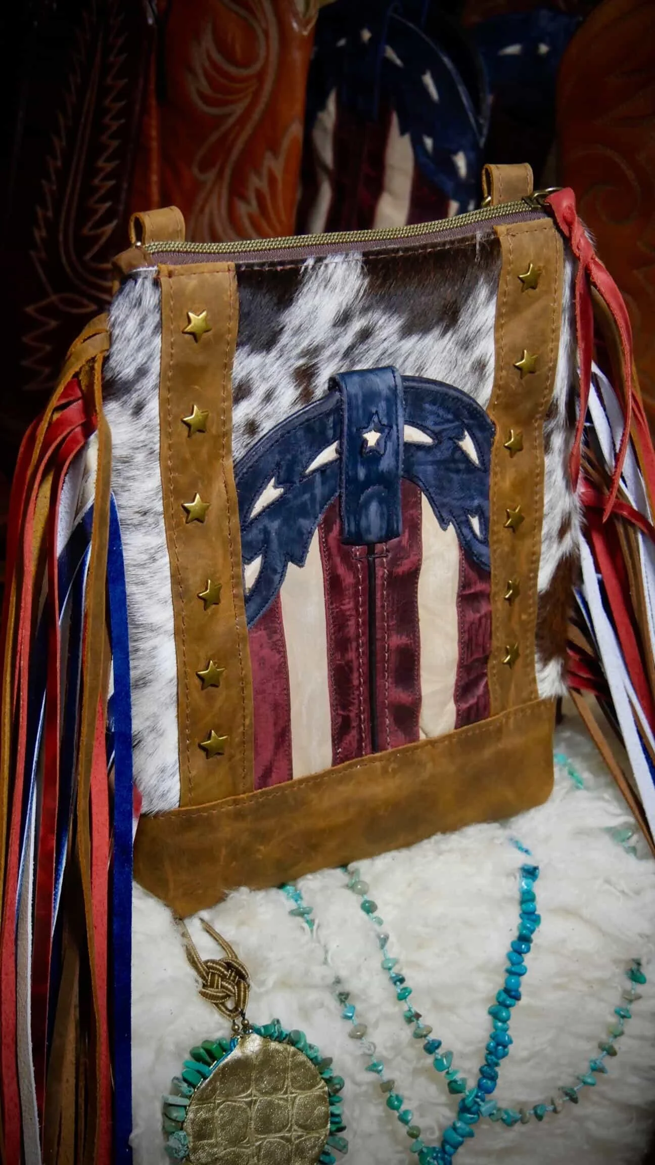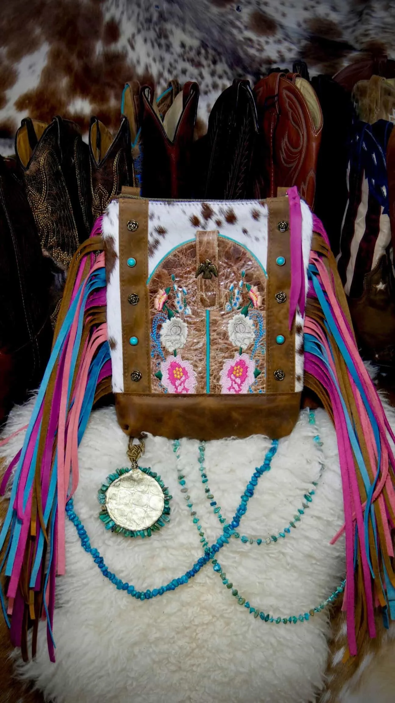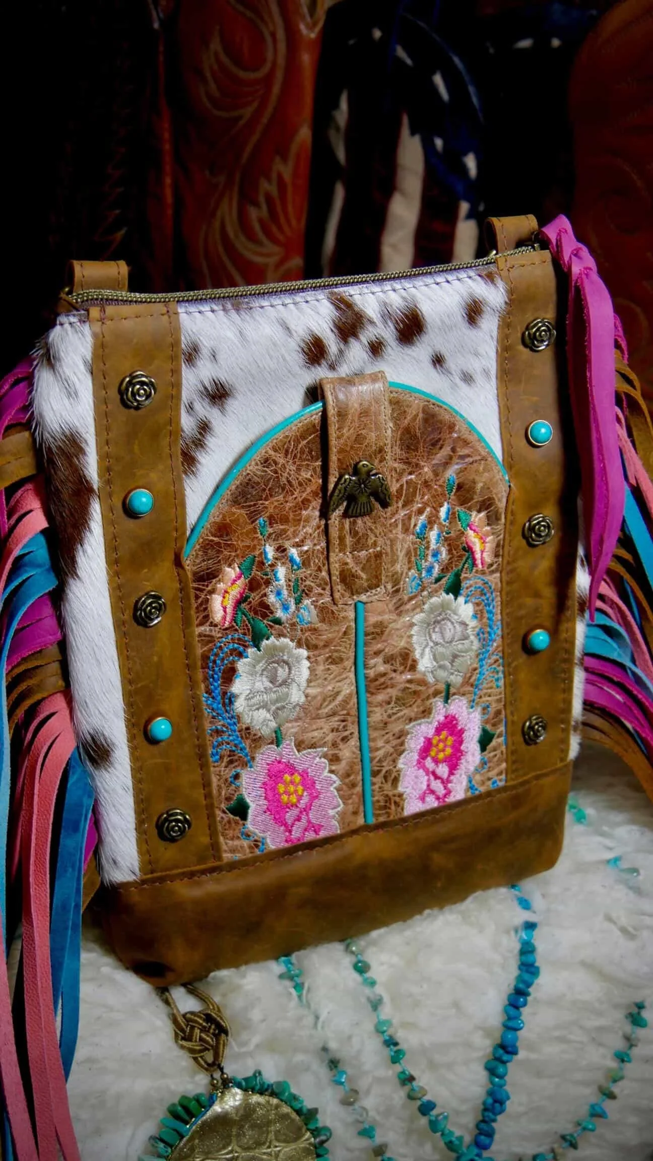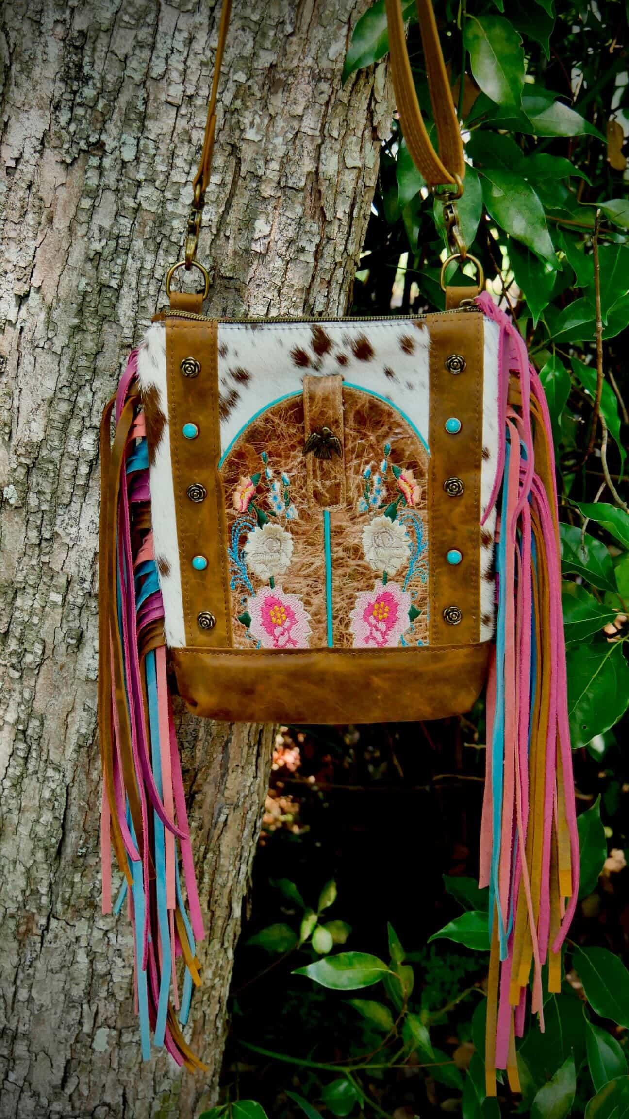 The front features a turquoise and red repurposed cowboy boot exterior slip pocket, perfectly sized for your phone and rich with authentic stitching detail. A hair on hide front panel adds natural contrast and texture, making each piece completely one of a kind.