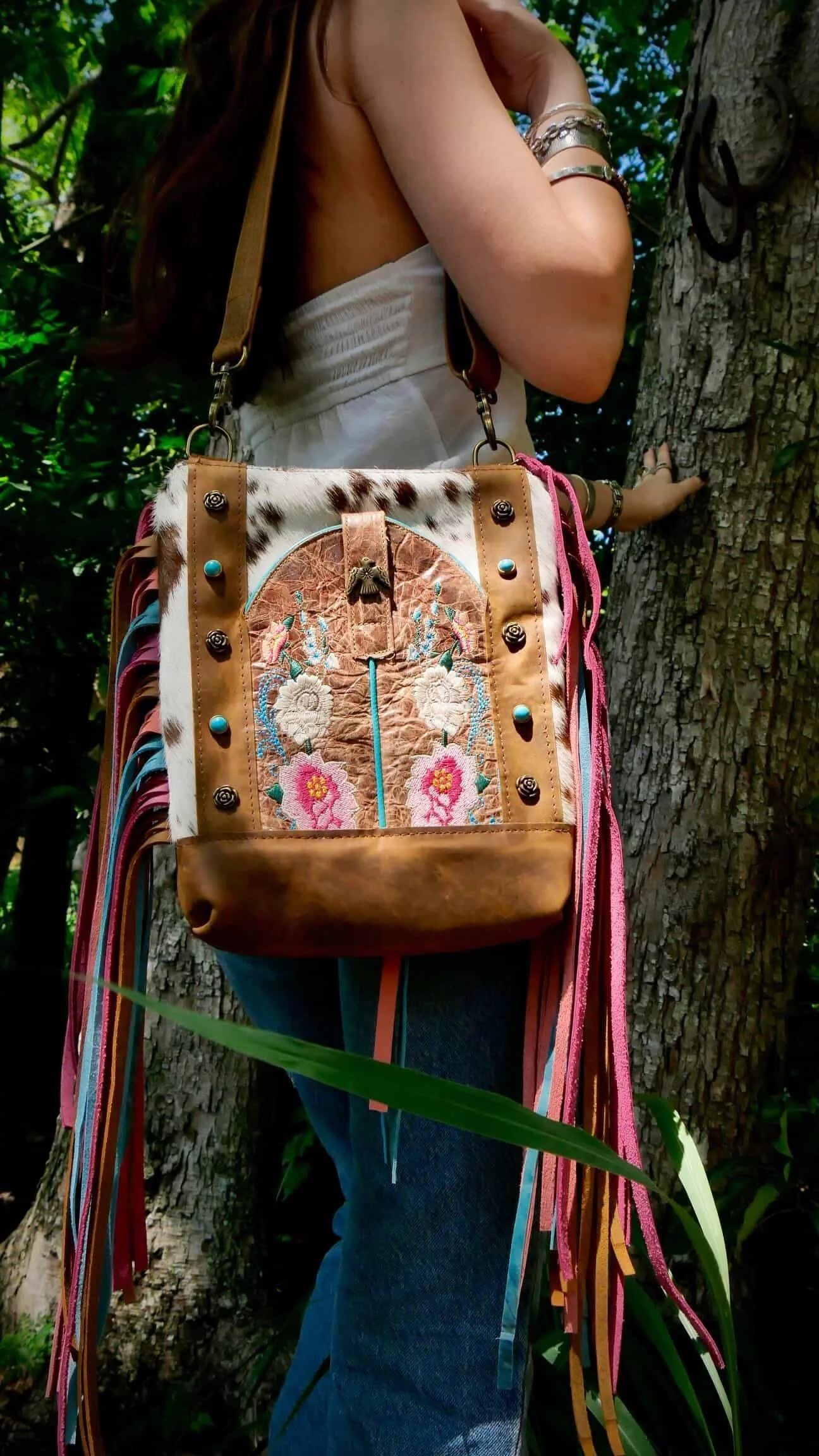 Finished with handcut fringe in coordinating turquoise and brown leathers, this piece moves with you bringing energy, texture, and unmistakable character.